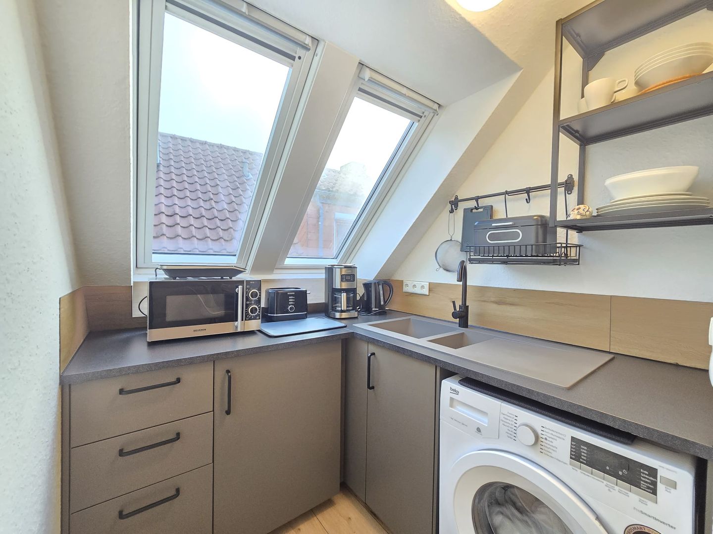 Voll ausgestattete Küche und komfortabler Wohnbereich