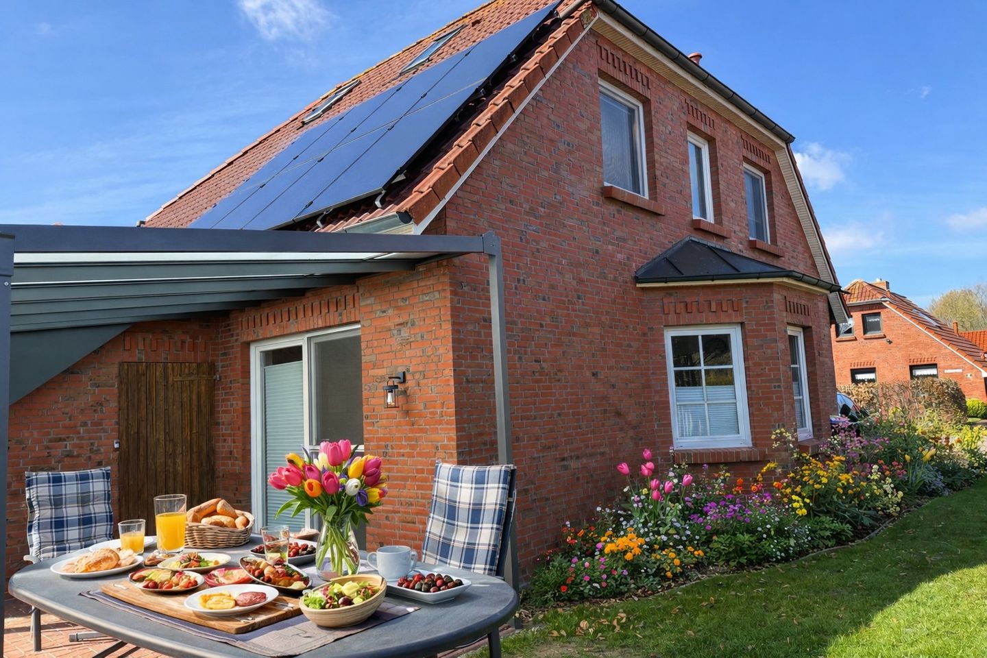 Der teilweise (zu etwa zwei Dritteln) eingezäunte Garten lädt zum Entspannen ein. Hier erwarten Sie hochwertige Loungemöbel sowie eine gemütliche, überdachte Terrasse, die von den frühen Morgenstunden bis in den späten Nachmittag hinein sonnendurchflutet ist – perfekt für Frühstück im Freien oder entspannte Abende. Ein kleiner Schuppen steht Ihnen ebenfalls zur Verfügung und bietet Platz für Fahrräder; zudem finden Sie hier einen praktischen Bollerwagen für Ausflüge.