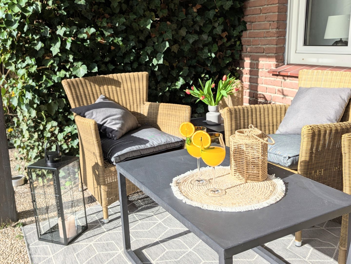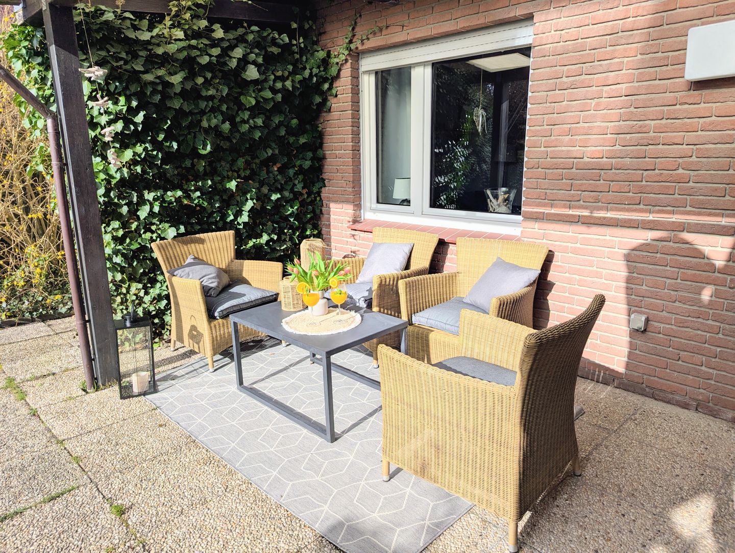 Die teilüberdachte Terrasse mit südwestlicher Ausrichtung lädt zum Sonnenbaden und Verweilen ein. Genießen Sie hier Ihr Frühstück, einen Nachmittagstee mit ostfriesischem Kuchen oder einen Sundowner am Abend – die frische Nordseeluft macht jeden Moment besonders.