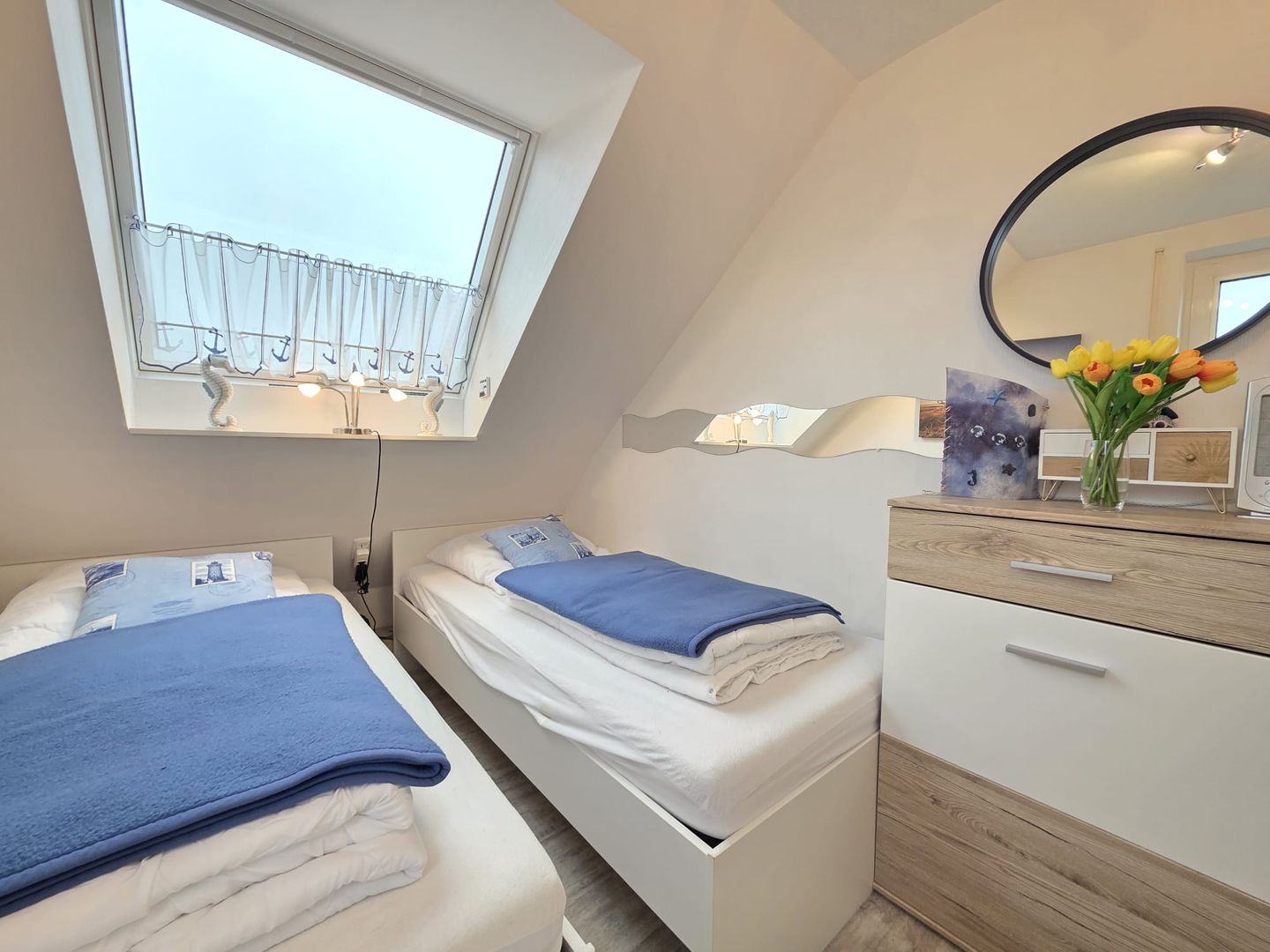 Im separaten Schlafzimmer sorgen zwei bequeme Einzelbetten für erholsame Nächte – perfekt für Freunde, getrennt schlafende Paare oder Alleinreisende. Der offene Wohn- und Essbereich lädt zum Ankommen ein: Die großzügige Couchlandschaft macht auch graue Tage gemütlich, und am Esstisch lassen sich herrliche Frühstücke oder lange, entspannte Abende verbringen.