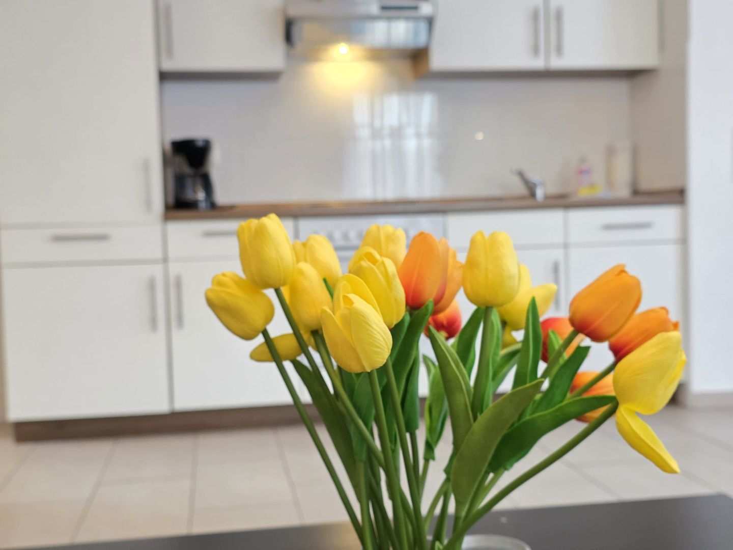 Zur Ausstattung gehören unter anderem Herd, Backofen, Spülmaschine, Kühlschrank, Mikrowelle, Kaffeemaschine, Wasserkocher und Toaster – ideal für Selbstversorger.