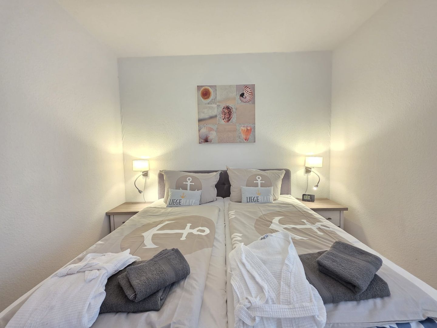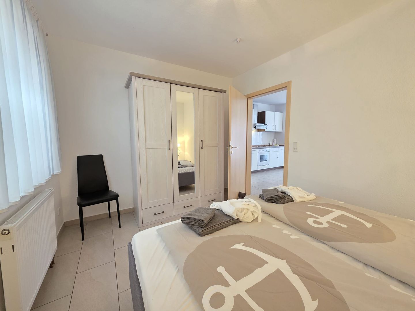 Die gemütliche Ferienwohnung bietet ein helles Schlafzimmer mit komfortablem Doppelbett (1,80 m) für erholsame Nächte. Der kombinierte Wohn- und Essbereich mit integrierter, voll ausgestatteter Küche lädt zum Wohlfühlen ein.