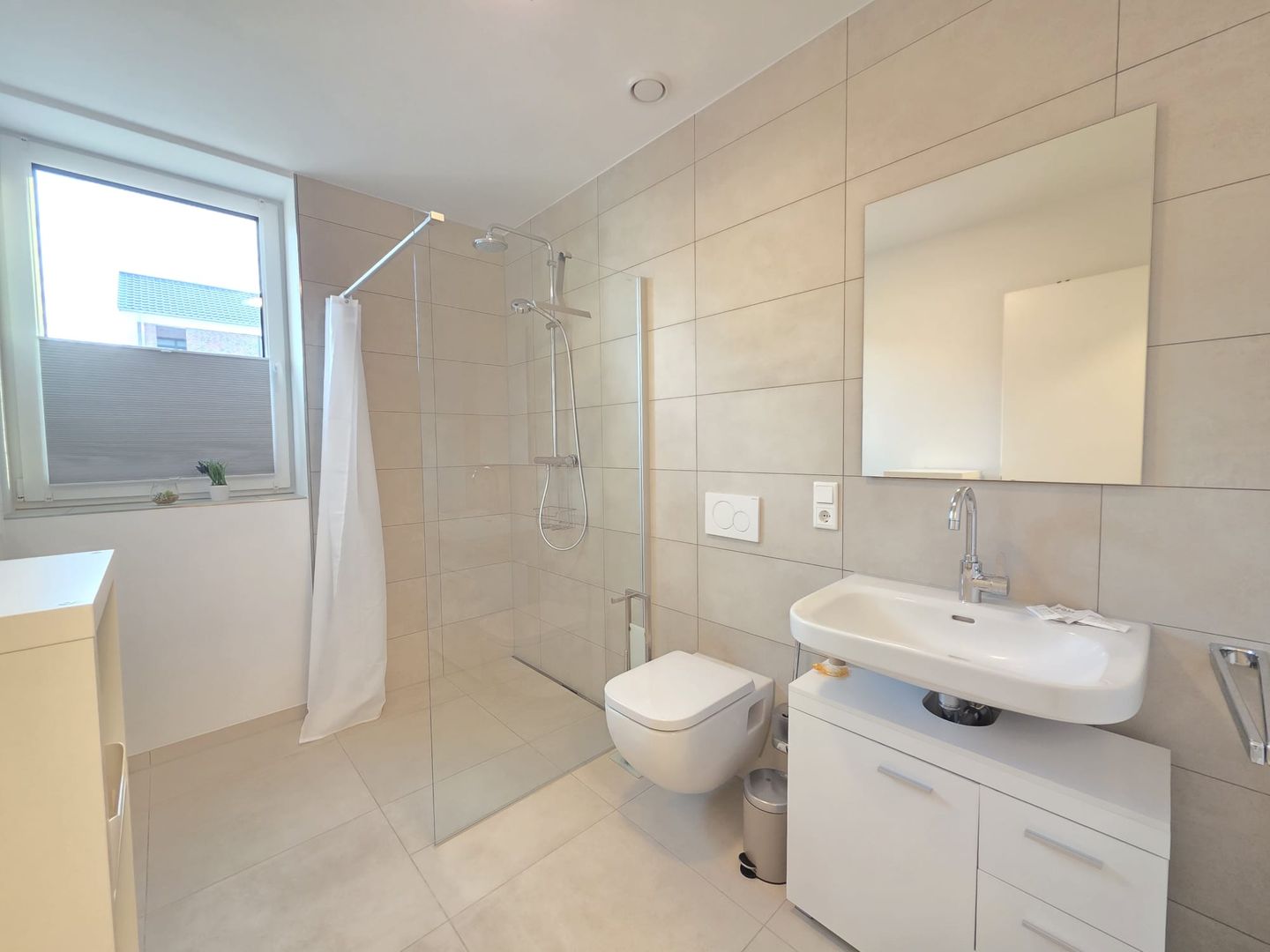 Das großzügige Badezimmer bietet viel Komfort und Platz. Es verfügt über eine moderne, begehbare Dusche, ausreichend Ablageflächen sowie ein Fenster, das für Tageslicht und angenehme Belüftung sorgt.